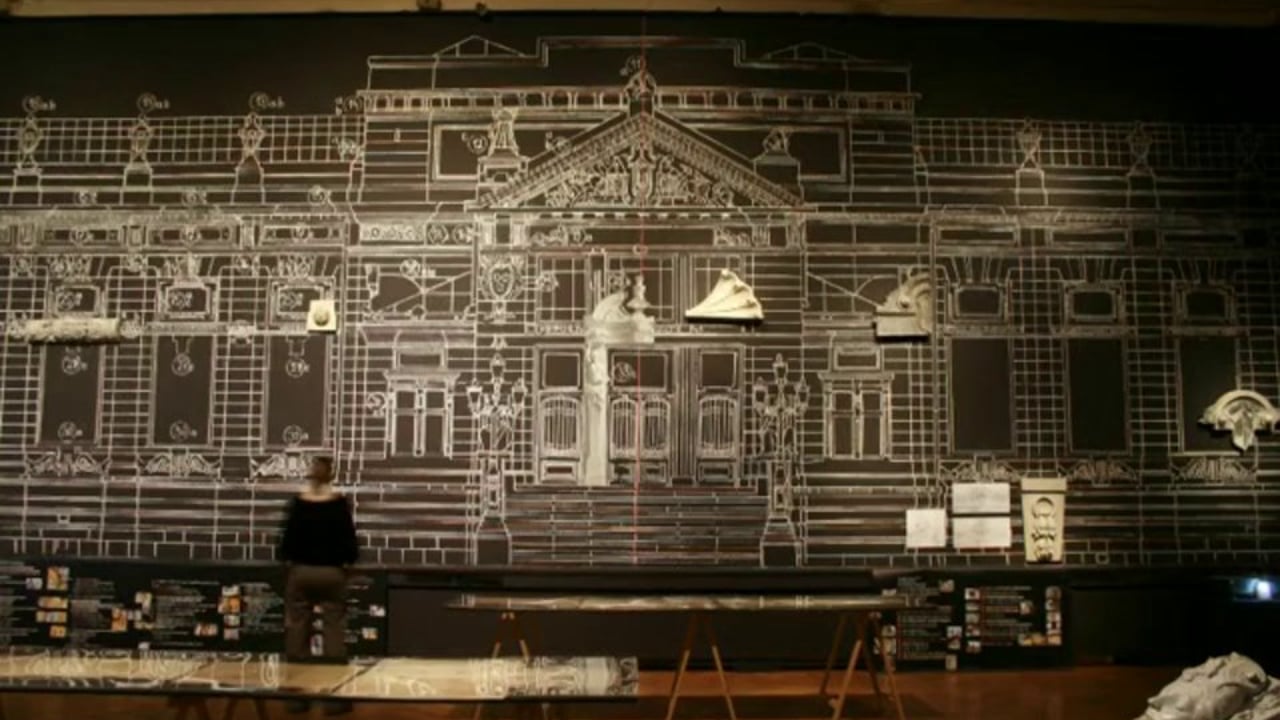 The exhibition is divided into two thematic units: 1. Renovation of the building and 2. The vision of the Art Pavilion for the 21st century. For the first unit, two large murals were drawn in chalk by hand to show the most important blueprint of the building on which the restoration was based. The first thematic unit was made in black and white and a second one was presented in color through different media which showed what the Art Pavilion is today (exhibitions, catalogs, programs). One part was set for visitors to sign on the wall like the old craftsmen’s did during the renovation.