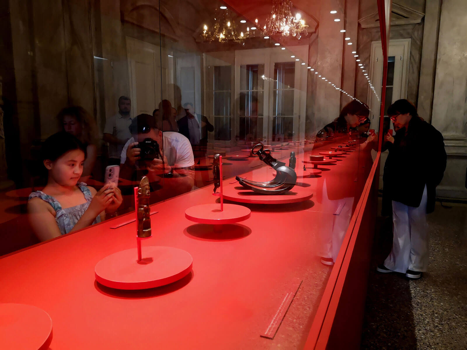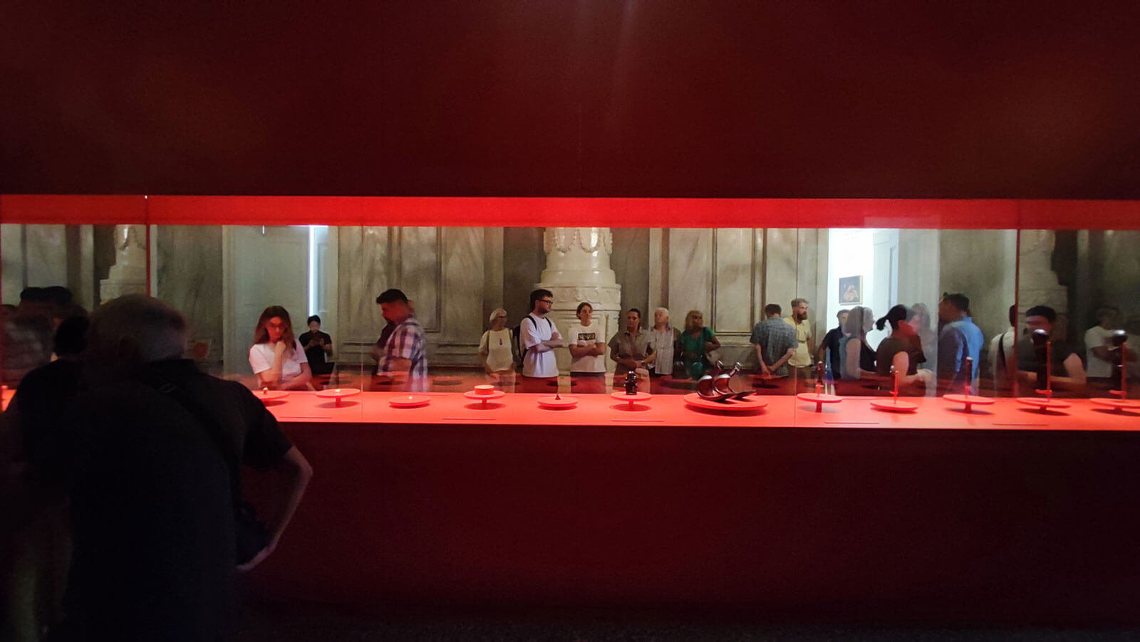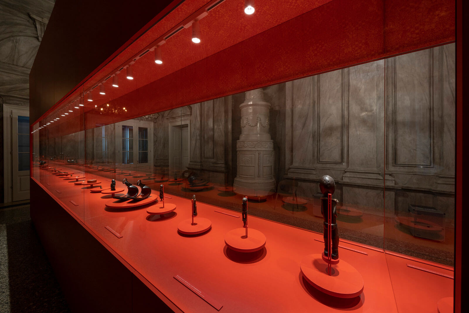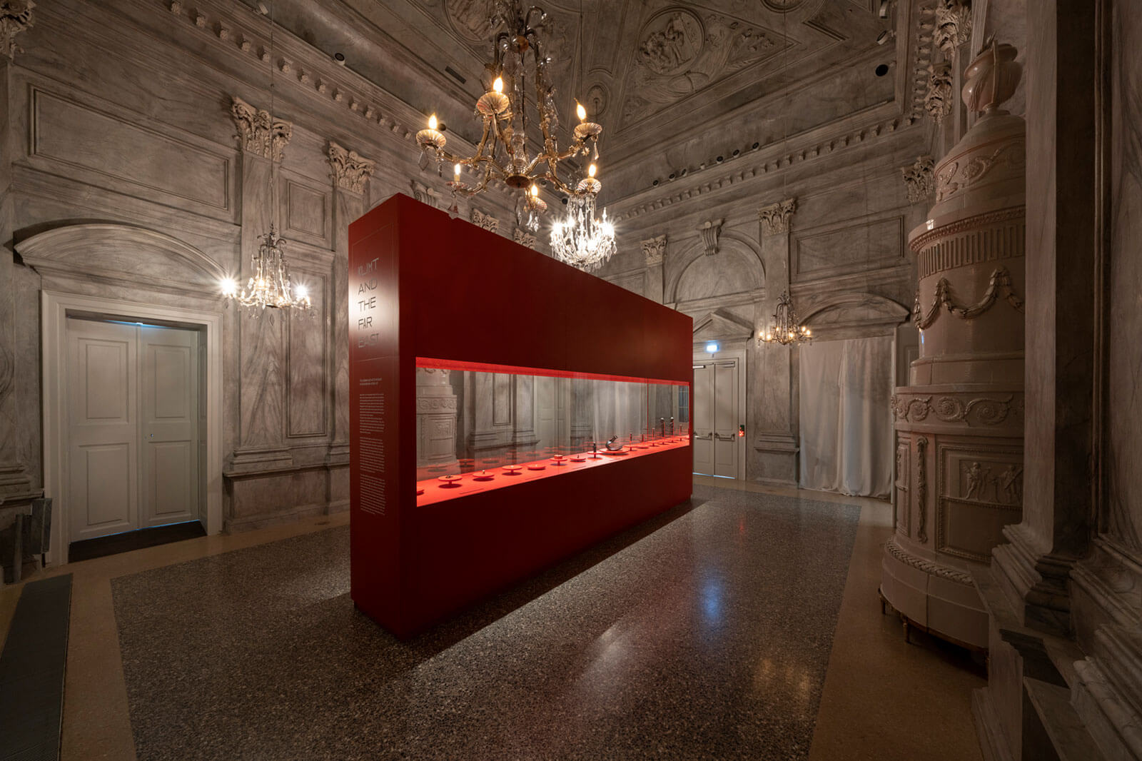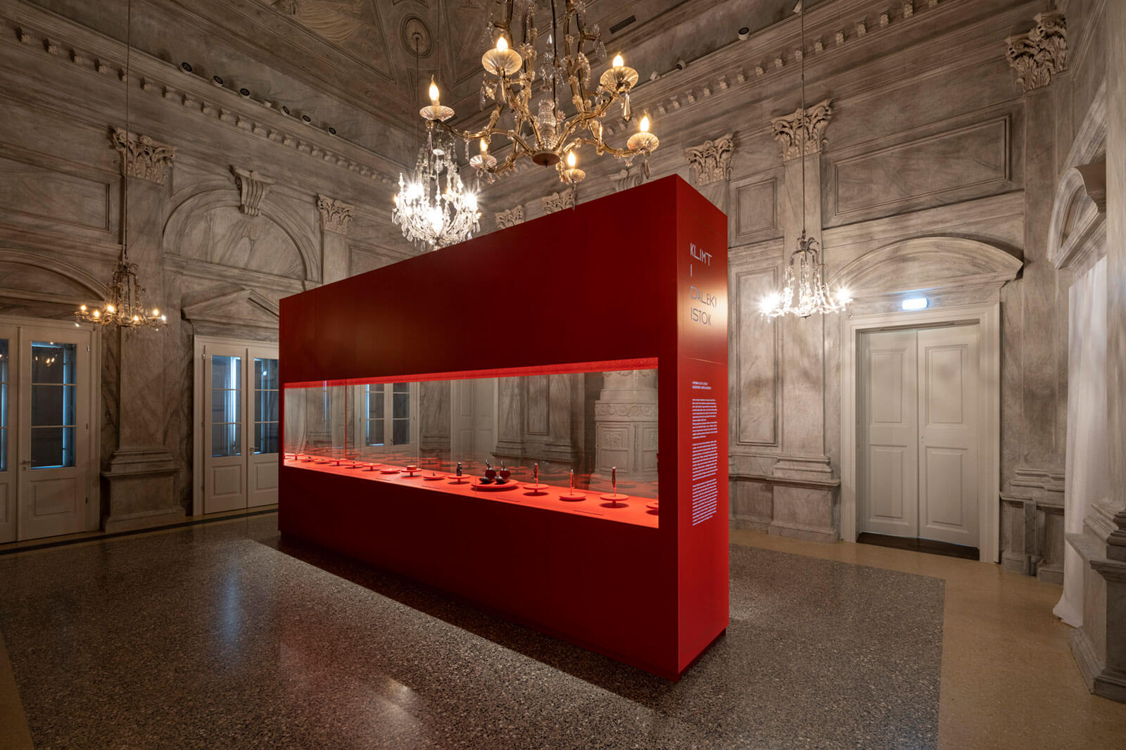 The exhibition design harmonizes with the genius loci of the striking interior of the Palace. A central display case, encased in mirrors, creates an endless visual dialogue between the objects, their reflections, and the viewers themselves—symbolizing the perpetual influence of Klimt’s art. These mirrors not only reflect the exhibits but also echo the interior’s ornate details and a specially designed texture featuring signature Klimt motifs.